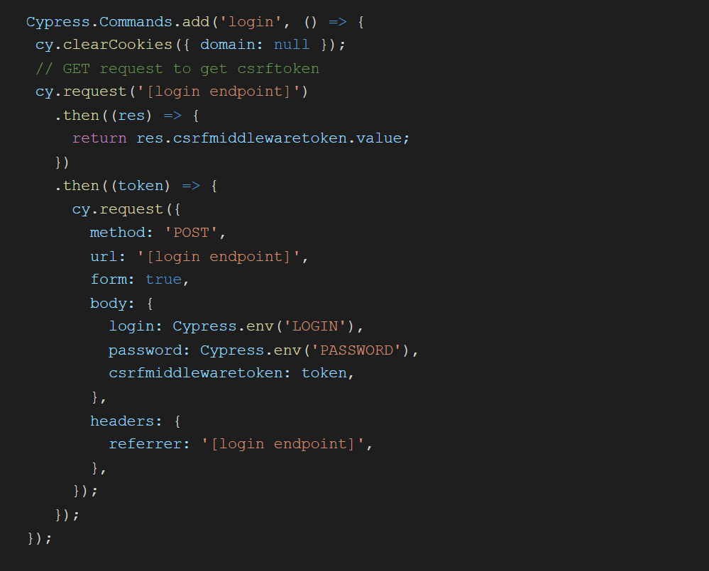 We then log into mapset using a custom command. The custom command code depends on the app login process. In our case we run a GET request() to the login endpoint and extract a CSRF token, which we then add to the body in a POST request to the login endpoint along with an email and a password. The email and password values are passed into Cypress in gitlab as environment variables. Note that Cypress environment variables need to be capitalised.